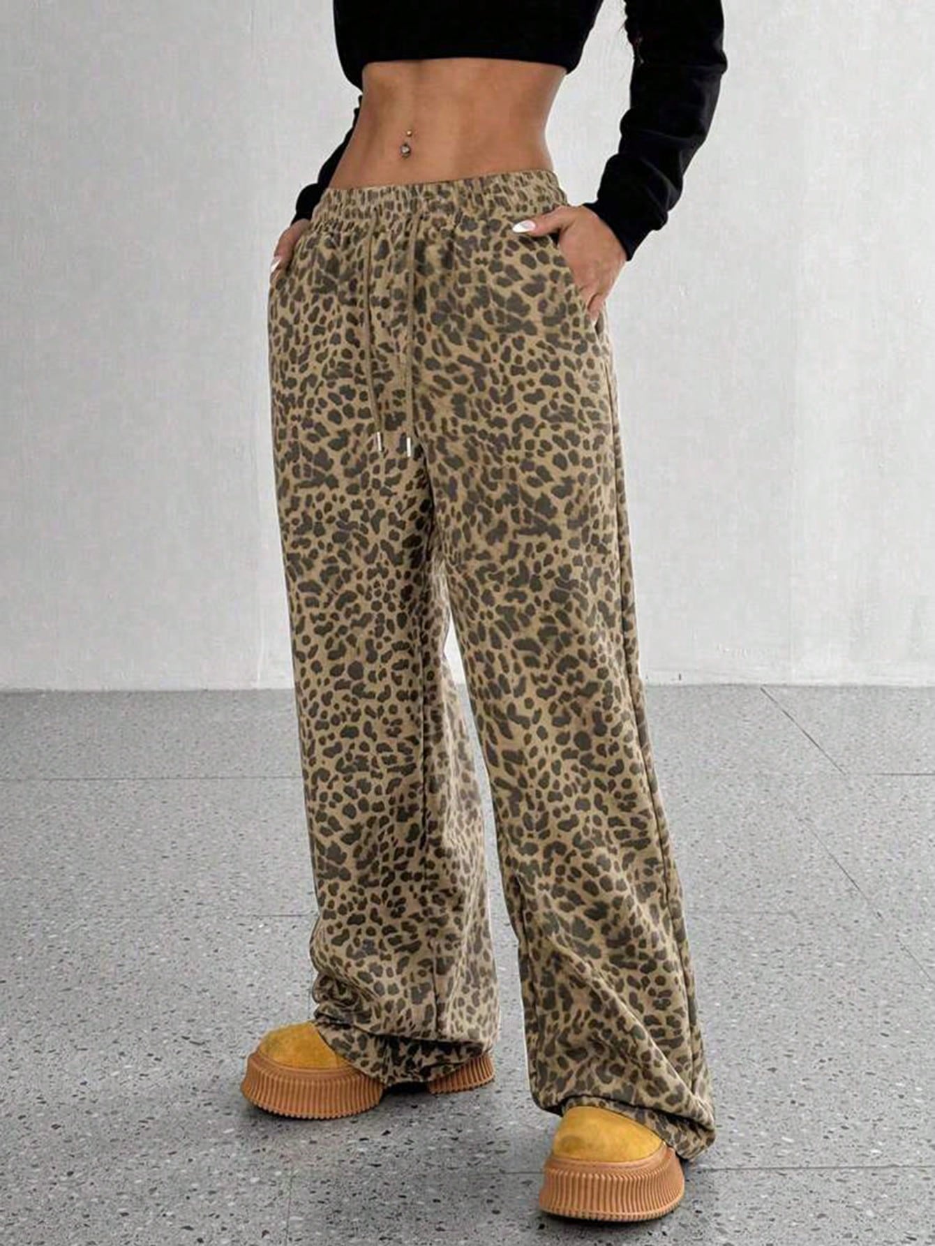 Spodnie damskie z szerokimi nogawkami, wiosennym nadrukiem w panterkę, luźne, ze ściągaczem w pasie